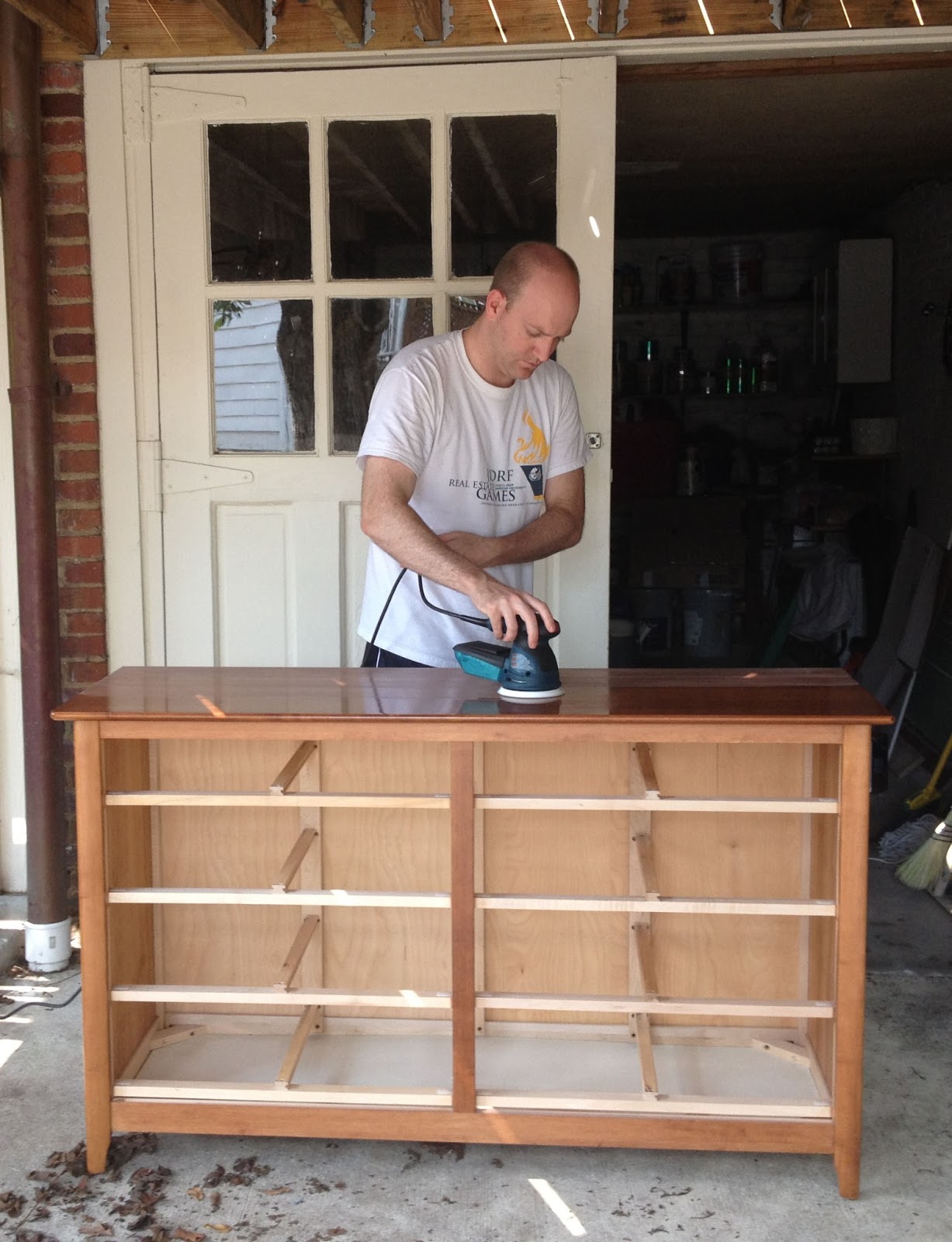 first, we had to fill in a crack along the top of the dresser. we shoved it full of wood filler and let it dry. then we sanded. and sanded. and sanded. we used the random orbital on the large expanses and hand-sanded corners and edges. i used a sponge wrapped in sand paper. we started with a coarse grit and worked our way to finer. not super fine (yet), just prepping. we wiped everything down to get rid of the sandpaper.